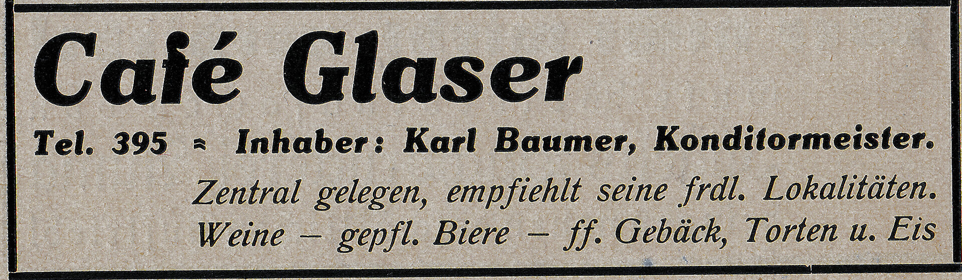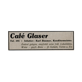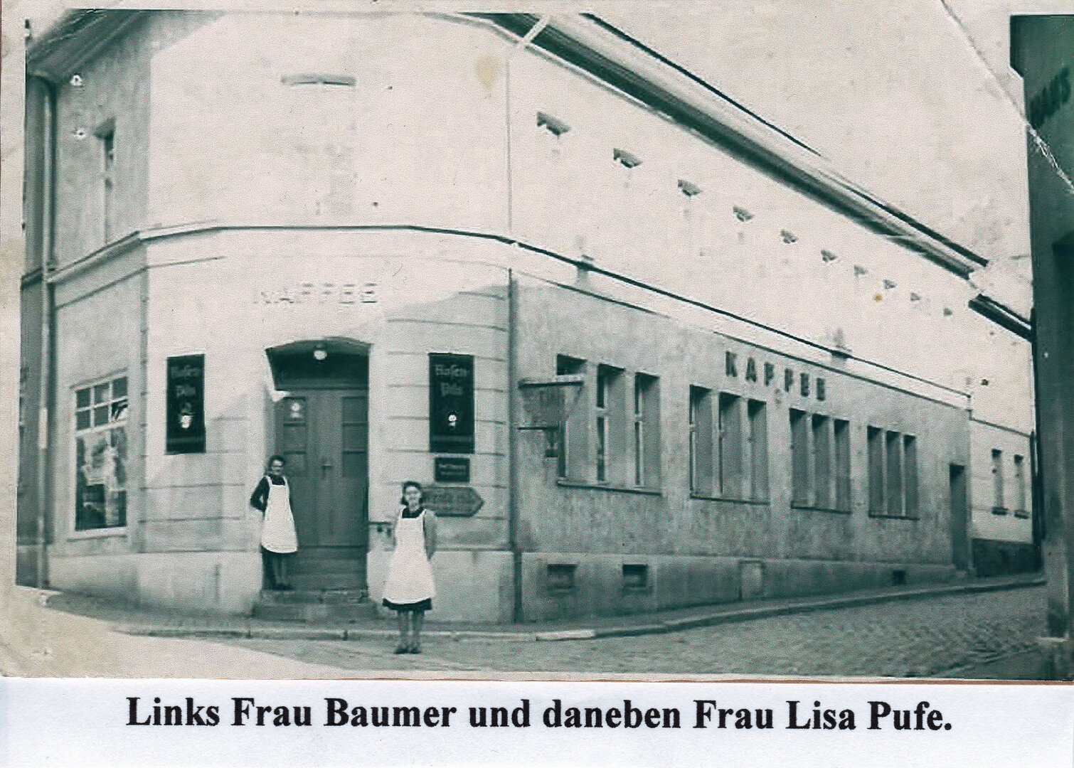 Im Jahr 1934 übernahm der Konditormeister Karl Baumer, aus Bad Dürkheim kommend, mit seiner Familie das Kaffee GLASER. Die Inneneinrichtung des ehemaligen Kaffees wurde bei Übernahme gekauft und Karl Baumer wurde gleichzeitig, wie schon vorher das Kaffee Glaser, Vertragspartner der Rosenbrauerei Pößneck.