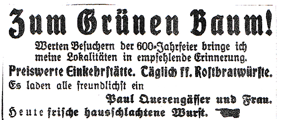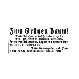 - 01.10.1912 - Kauf des Gasthofes zum "Grünen Baum" von der Brauereigenossenschaft Schleiz e.G.m.bH in Liquidation durch Christian Karl Querengässer aus Neuenbeuthen